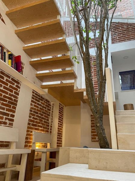 área común de escalera en alto diseño, Espiral Ascendente de Travertino Puro terminado mate y Madera en Fresno que da un sentir mediterraneo exquisito, con Luz Natural en todos sus rincones y una temperatura simplemente perfecta en todo el año.