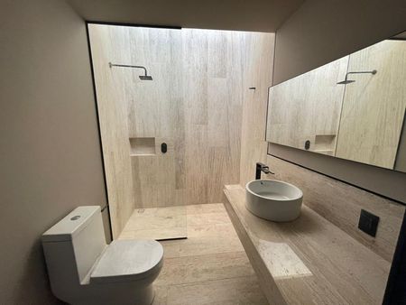 Casa con jardín de 70 m2, en dos plantas con excelentes acabados. 4 recámaras con baño y vestidor cada una. Cancelaría española, encino americano en puertas y granito.