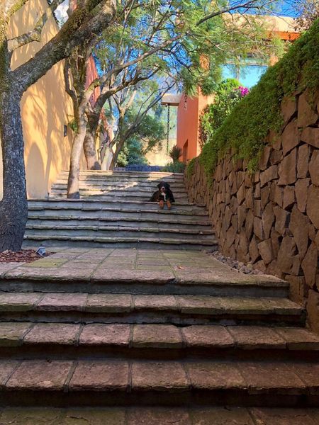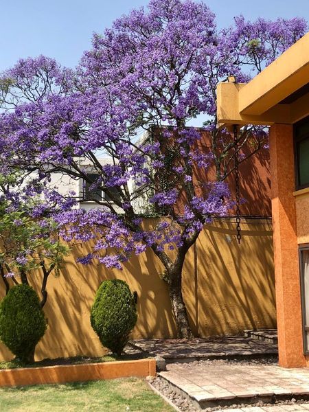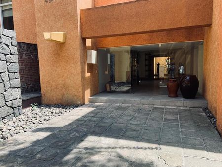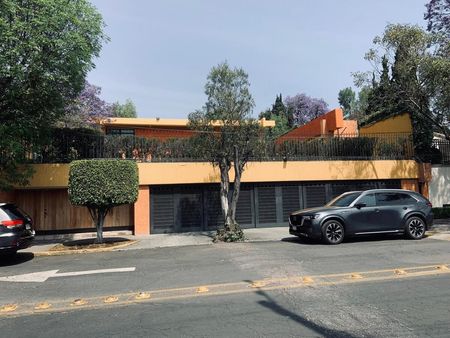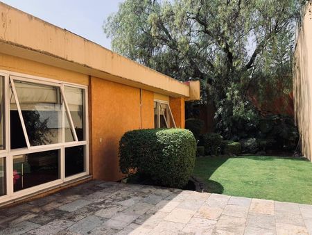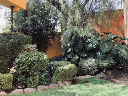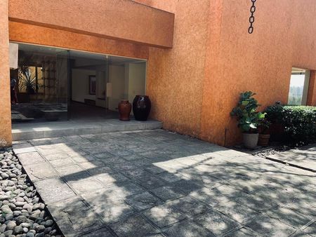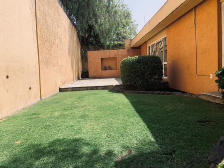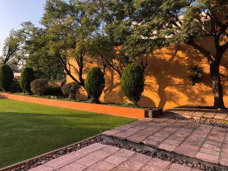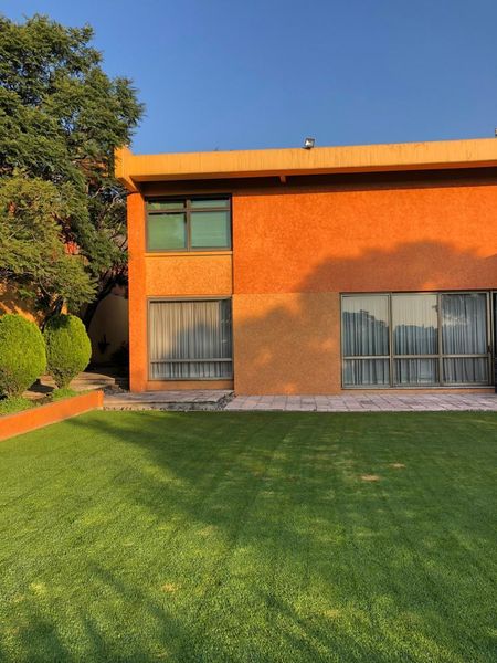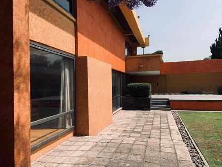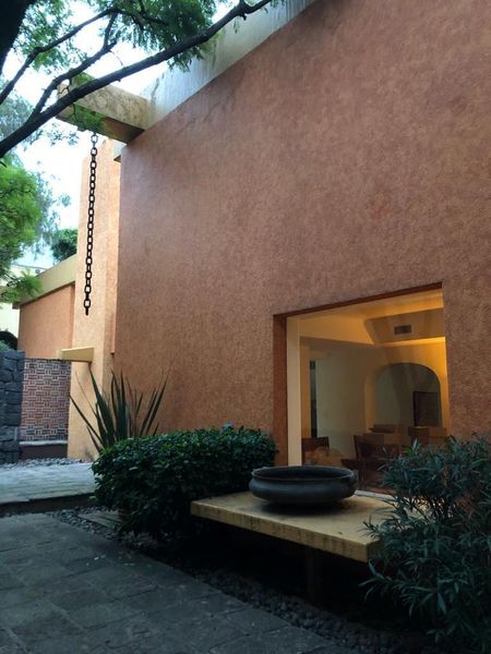 La casa es tipo Barragán con doble altura de techos , vigas , chimenea.