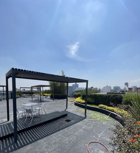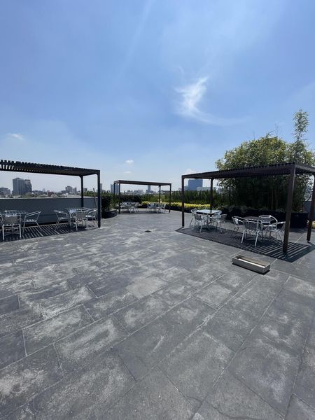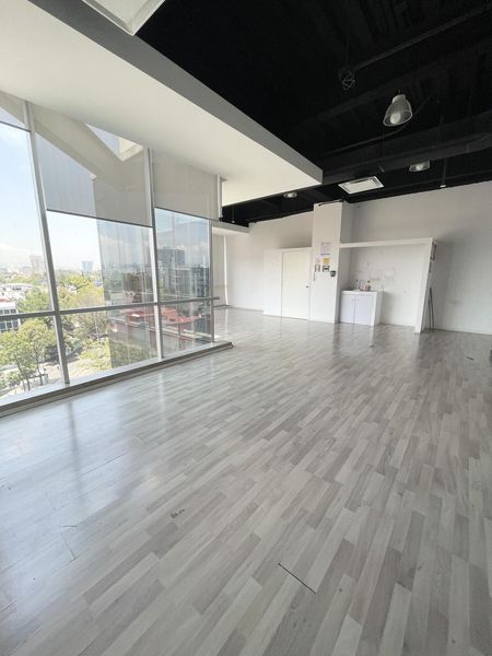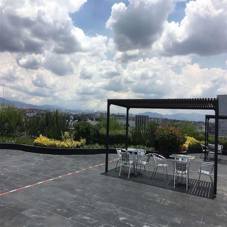 De 92m2 con renta de $47,000 cuenta con 3 cajones de estacionamiento y baño privado y baños comunes en cada pisos. El edificio es prácticamente nuevo, tiene 8 años de antigüedad y planta eléctrica, circuito cerrado, vigilancia las 24 horas, fibra óptica, 2 elevadores, acabados de lujo, Roof Garden común con hermosa vista panorámica.