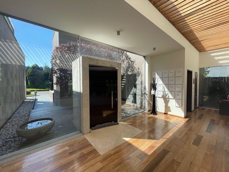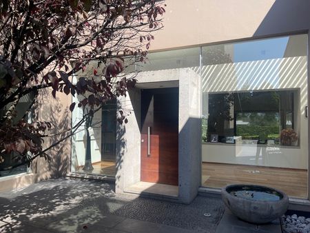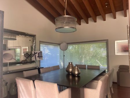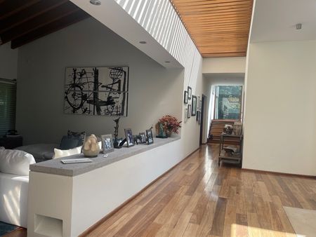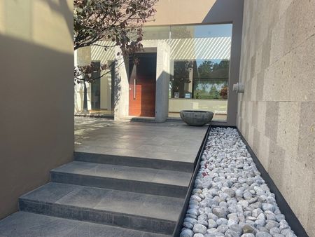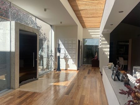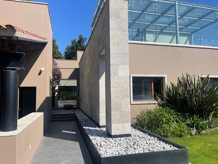 calefacción hidrónica, riego por asperción, Jardín con pasto ingles, acabados en mármol y cantera, pisos de ingeniería, canceleria de importación, techos inclinados con vigas y tarimas de madera