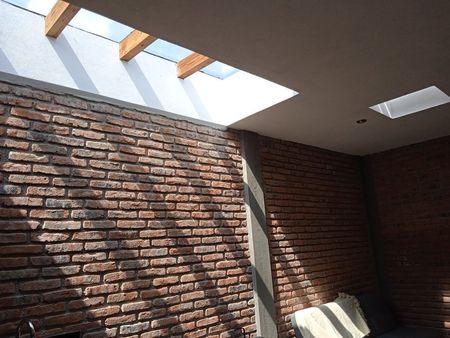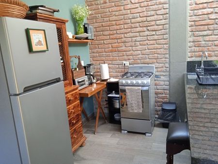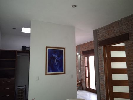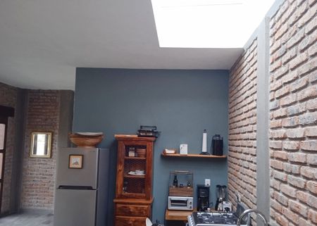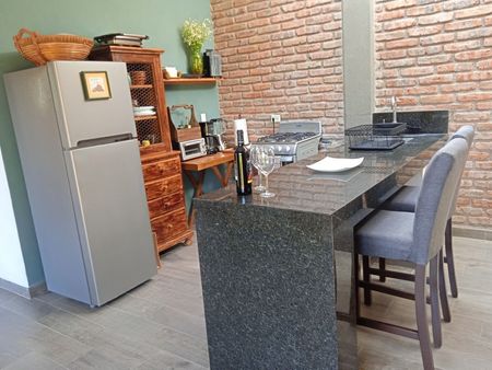 Superficie 65 mts, con techos altos, domos y excelente iluminación. Cuenta con un baño amplio, recámara con cama king size, sofá cama, y vestidor grande. Terraza y jardín compartido con la casa contigua. Cocineta con refrigerador, estufa, electrodomésticos, utensilios de cocina, barra de granito, pantalla de TV y lavadora (compartida) . Ubicado en fraccionamiento abierto, frente a un parque. A unas cuadras se encuentran transporte público, tiendas de conveniencia, hospital y restaurantes. Distancia 30 minutos caminado al Centro, 10 minutos en auto.