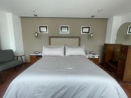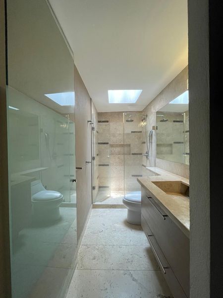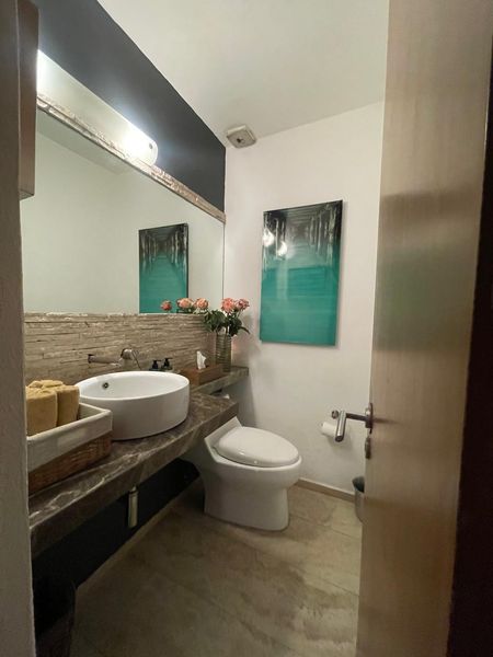 Excelente casa de 203.4 m2 de terreno y 177mts2 de C, en dos plantas , la PB cuenta con un patio central con muro llorón, que da a la estancia principal con sala comedor y al cuarto de TV , la cocina equipada tiene desayunador cuarto de lavado y de servicio, y medio baño de visitas . El primer piso tiene tres recámaras , la principal con vestidos y baño y sala de tele y las secundarias tienen closet y comparten un baño. y en la tercera planta está una zona ideal para oficina con baño . La casa cuenta paneles solares, cisterna y con dos lugares de estacionamiento, vigilancia las 24 horas.