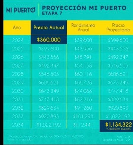 Terrenos desde 300 mts2 con un fondo de 30mts2 y frente de 10mg se, en Vía Marina -Mi Puerto, está es la etapa 7 precio por M2 $1,200.00 calles blancas y mojoneras, entrega de amenidades en 60meses y escritura y entrega en 48 meses .Financiamiento sin intereses, uso de suelo habitacional, psneles de luz solares, pozo de agua y biodigestor, amenidades como casa Club, Pool bar, Pet Park, arenero infantil, playita relax , jardín de hamacas, Tipi elevado, Sendero traviesa.