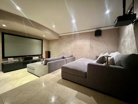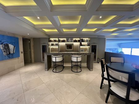 El inmueble cuenta con tres amplias recámaras, baños completos y walking closets. Consta de una sala y un comedor, espléndidos para reuniones familiares o sociales. Tiene un bar y un cine. Dos medios baños.