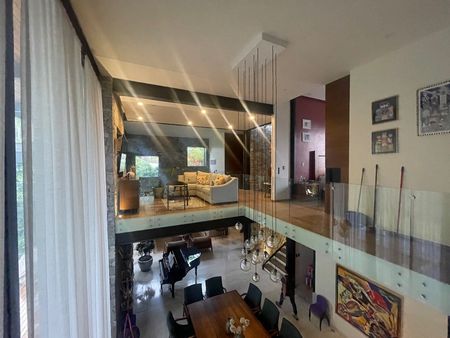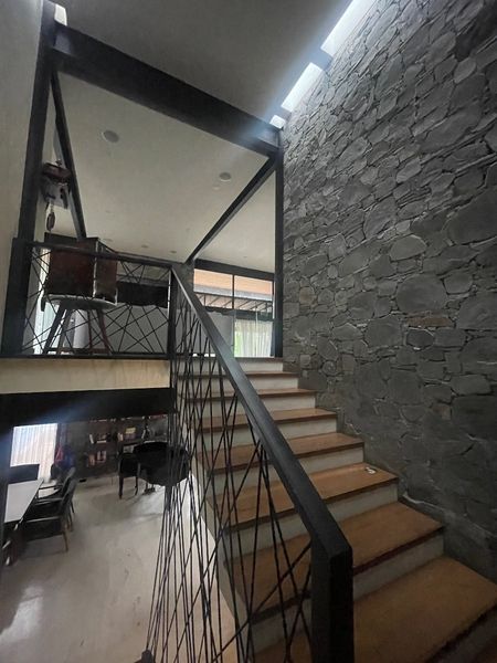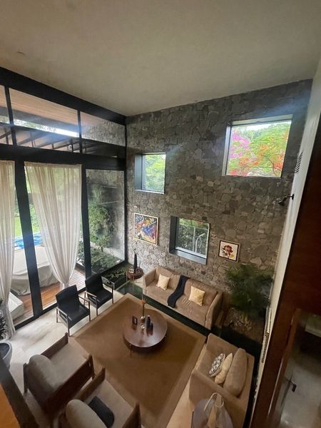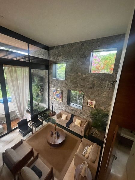 Sus muros de piedra, el cristal, la madera y el acero le dan a la casa una sensación de paz y calidez. Los espejos de agua y las áreas grandes a doble altura se conectan entre sí dando una sensación de conectividad y entrelazan a toda la casa.